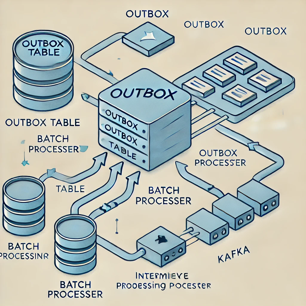 Outbox 패턴은 데이터베이스와 메시지 브로커 간의 작업을 분리하면서도 일관성을 보장하는 아키텍처입니다. 애플리케이션에서 데이터를 저장할 때, 동일한 트랜잭션 내에서 메시지 데이터를 별도의 Outbox 테이블에 기록합니다. 이후, 배치 작업이나 별도의 프로세스를 통해 Outbox 테이블에서 메시지를 읽고 메시지 브로커에 전송합니다.